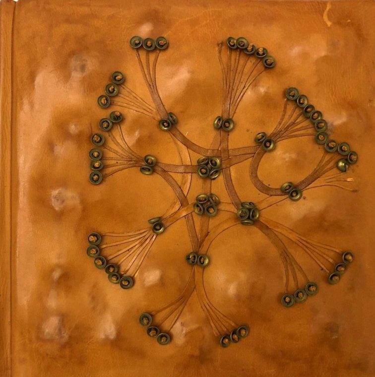 Valda Āboliņa “Viesu grāmata”, polihroma cūkāda, aplikācija, metāls, kartons, papīrs, 21x21x4cm, 1973, LMS muzejs.